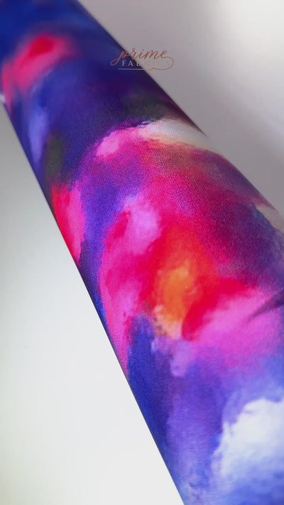 A bold silk that feels like art in motion. This 4-ply silk crepe carries weight and substance, giving it a fluid, statuesque drape that holds presence on the body. The surface has a refined, matte texture, balancing the intensity of its print. The design is an explosion of painterly color—deep cobalt and violet, broken by flashes of fuchsia, crimson, orange, and yellow—like a canvas alive with energy. Perfect for gowns, statement blouses, or tailored pieces where both structure and movement are desired.
