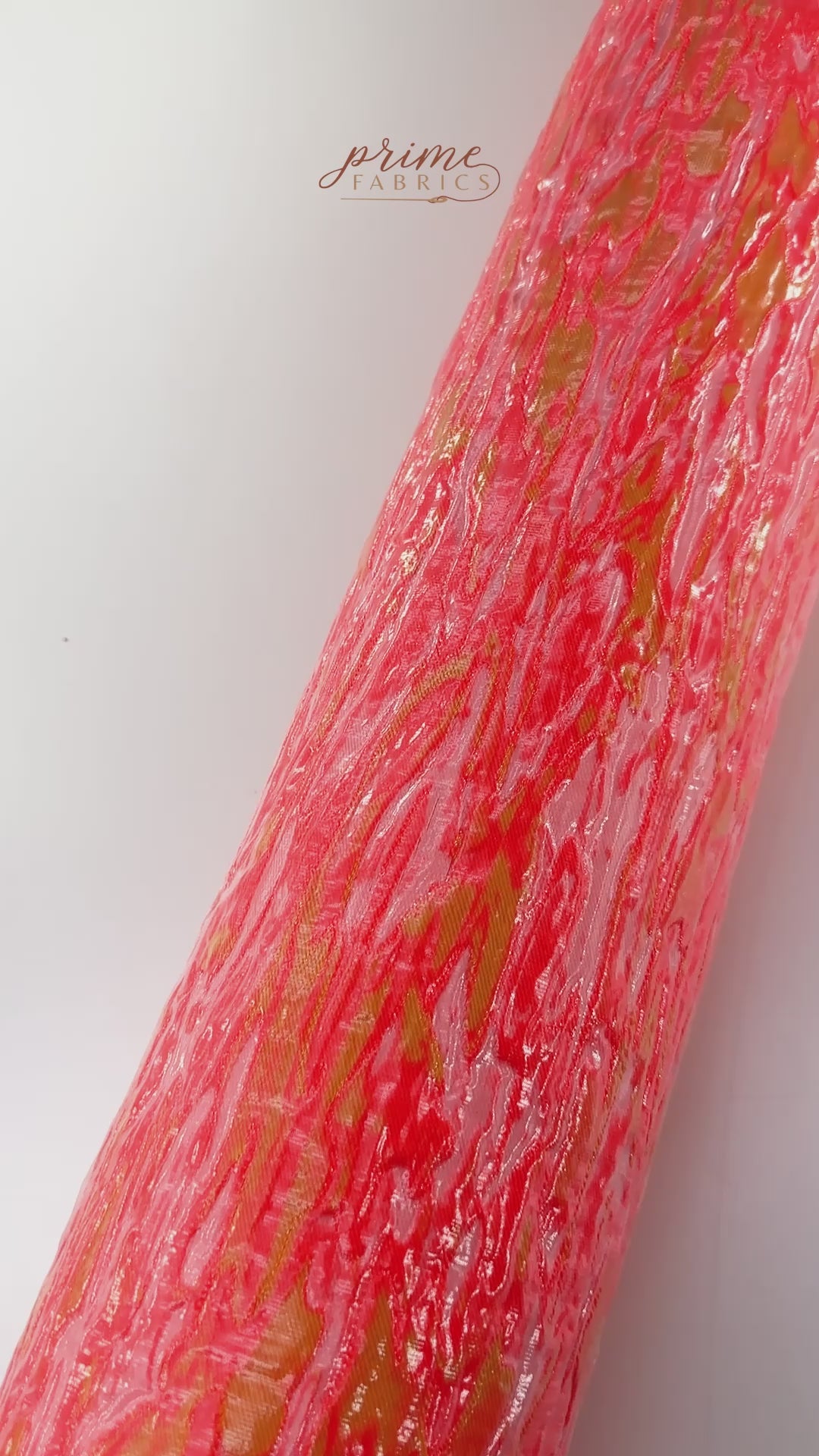 This brocade blazes with intensity—fiery tones of neon orange, pink, and yellow layered in a molten, liquid-like pattern. Its midweight body holds a structured drape, perfect for designs that demand bold architecture. The surface has a laminated-like finish, catching the light with a glossy sheen that heightens its dramatic impact. A statement textile for avant-garde tailoring, sculptural coats, or show-stopping eveningwear.