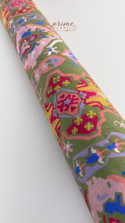 This viscose-linen blend is airy, breathable, and fluid, making it perfect for warm-weather wear. The print feels like a modern interpretation of a classic kilim—soft green grounds accented with geometric medallions in warm yellow, coral, and blush, with touches of blue for contrast. Light in weight with a soft drape, it’s ideal for flowy dresses, relaxed trousers, tops, or statement skirts that carry a laid-back elegance.