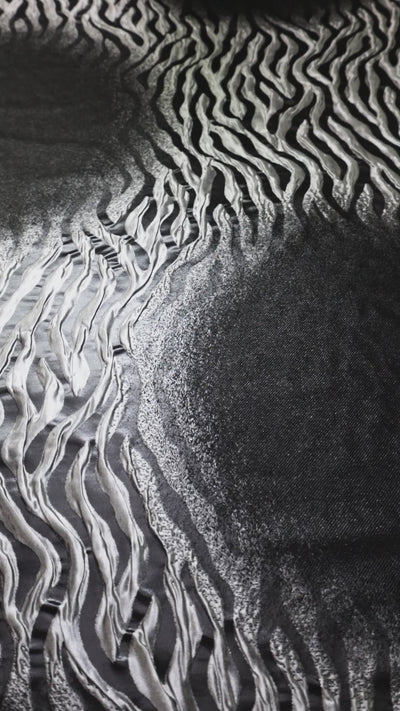An avant-garde Armani brocade that plays with texture and contrast in a mesmerizing gradient effect. The design transitions from a deep black textured center, gradually dispersing into a smooth, animal-inspired pattern. This interplay of raised and sleek surfaces creates a dynamic, almost fluid visual effect. Medium-weight with a moderate drape, this fabric is perfect for statement jackets, sculptural dresses, and high-fashion pieces that embrace movement and depth. A true fusion of artistry and luxury.