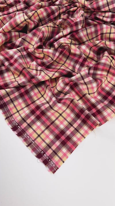 Midweight with a dry hand and balanced drape—supple enough to move yet structured enough for tailoring. The rose, cream, and burgundy check has a soft warmth, ideal for jackets, skirts, or suiting that carries both ease and polish.