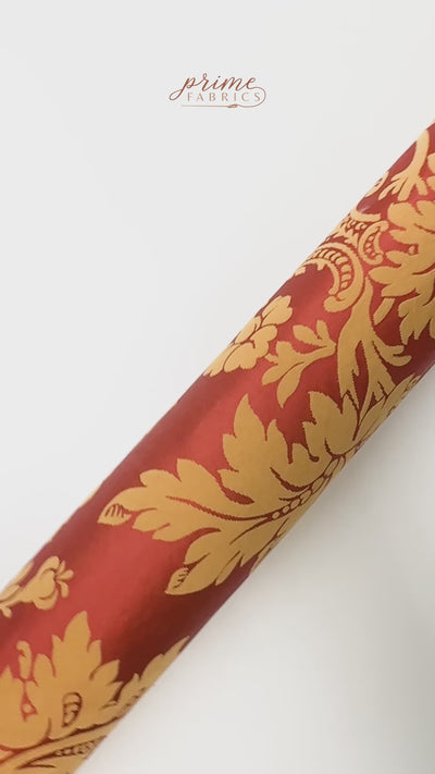 A silk-viscose jacquard with a regal floral baroque motif in rich gold over a deep burnt orange ground. Lightweight with a crisp, structured drape, it has a subtle sheen that highlights the intricate woven design. Ideal for statement pieces—structured dresses, evening jackets, or decorative applications that call for drama and elegance.