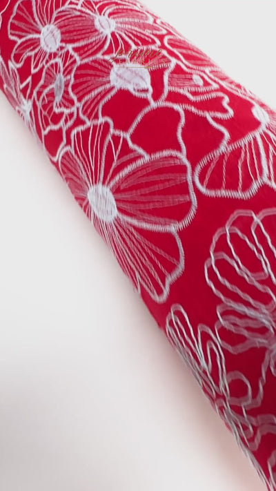 This lightweight linen features light blue cotton embroidery stitched into a floral outline that pops against a fiery red base. Slightly sheer with a soft two-way stretch, this fabric feels breathable and alive—ideal for elevated shirts, flowy dresses, or anything that deserves texture with movement.