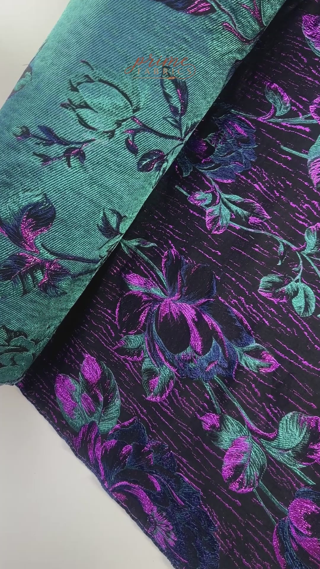 A rich metallic brocade with a dark, inky ground layered in jewel tones of violet, teal, and hints of blue. The floral motif feels almost luminous, with metallic threads catching the light and giving the surface depth and movement. It has enough body to hold shape while still feeling refined, making it ideal for statement jackets, dresses, or evening pieces that lean dramatic without feeling overdone. This is the kind of fabric that does most of the talking on its own.