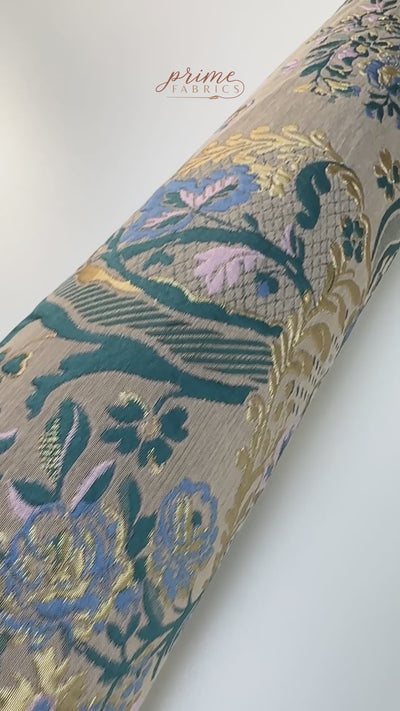This metallic brocade feels architectural without being heavy, holding its shape with a clean, confident drape. Teal and soft blue florals weave through a warm light taupe ground, with metallic threads catching light in a way that feels refined, not flashy. The pattern has a vintage elegance with a modern edge—ornate but controlled. Ideal for structured jackets, statement skirts, or sculptural evening pieces that need presence without bulk.