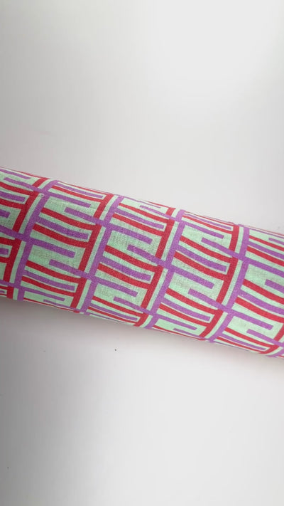 This linen has a playful, modernist vibe with its grid-like geometric motif made up of hand-drawn lines in red, lavender, and soft mint. The pattern feels rhythmic and graphic—like a retro tile or a Bauhaus-inspired doodle. Lightweight yet opaque, it’s perfect for shirts, breezy pants, or fun summer dresses that want to make a statement without being loud.