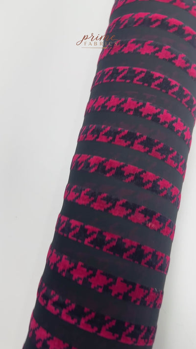 Houndstooth Striped Flocking Devore - Raspberry Pink / Black