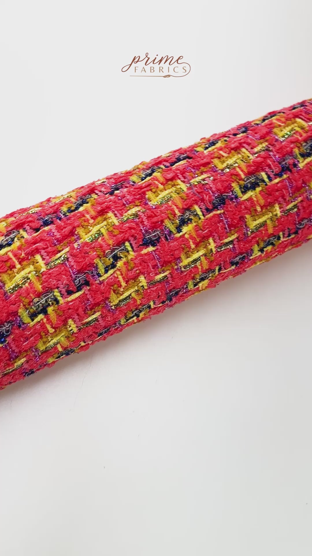 A vibrant wool-cotton tweed woven with metallic threads and rich texture. Bold pinks, yellows, and flashes of sparkle make this a standout fabric for jackets, skirts, or statement tailoring. Dramatic and unapologetically luxe.
