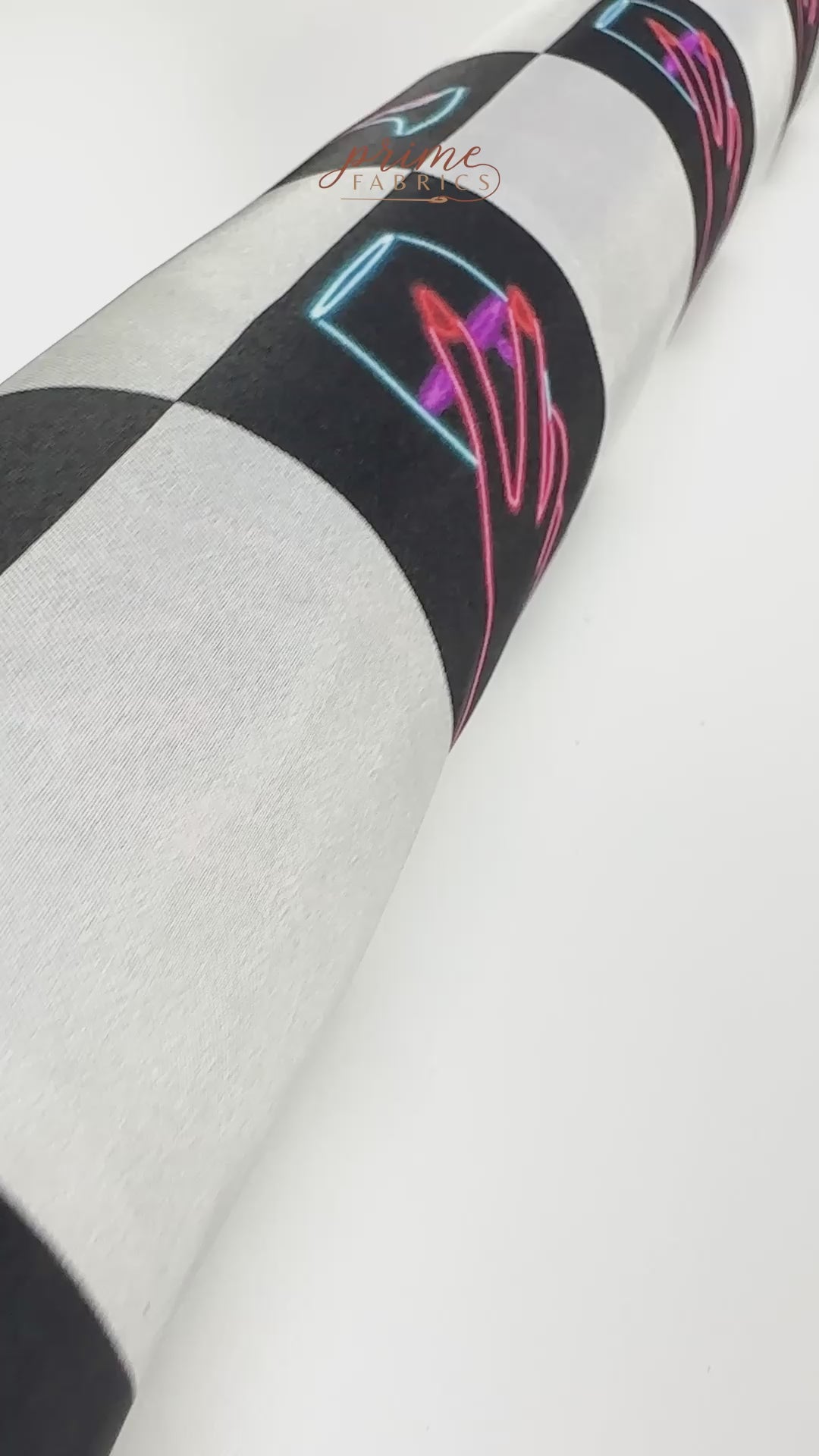 Lightweight silk twill with a bold checkerboard print and a neon-style hand and wine motif. The fabric has a playful, nightlife-inspired edge, perfect for statement blouses, scarves, or standout linings.