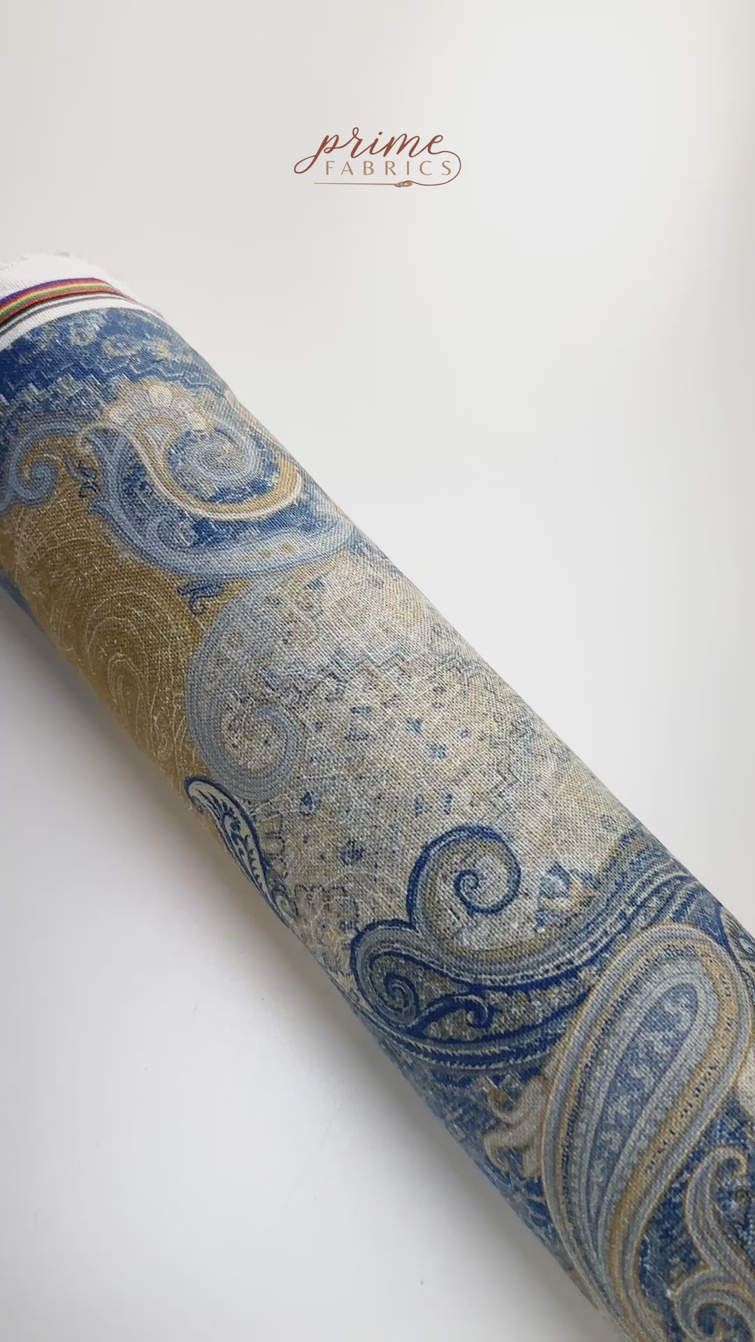 This printed linen makes a bold impression with an oversized paisley pattern in soft blue, ivory, and golden beige. The weight gives it structure and grip, while still retaining linen’s breathable, natural character. Ideal for tailored jackets, or statement home pieces—this one holds its shape and doesn’t shy away.