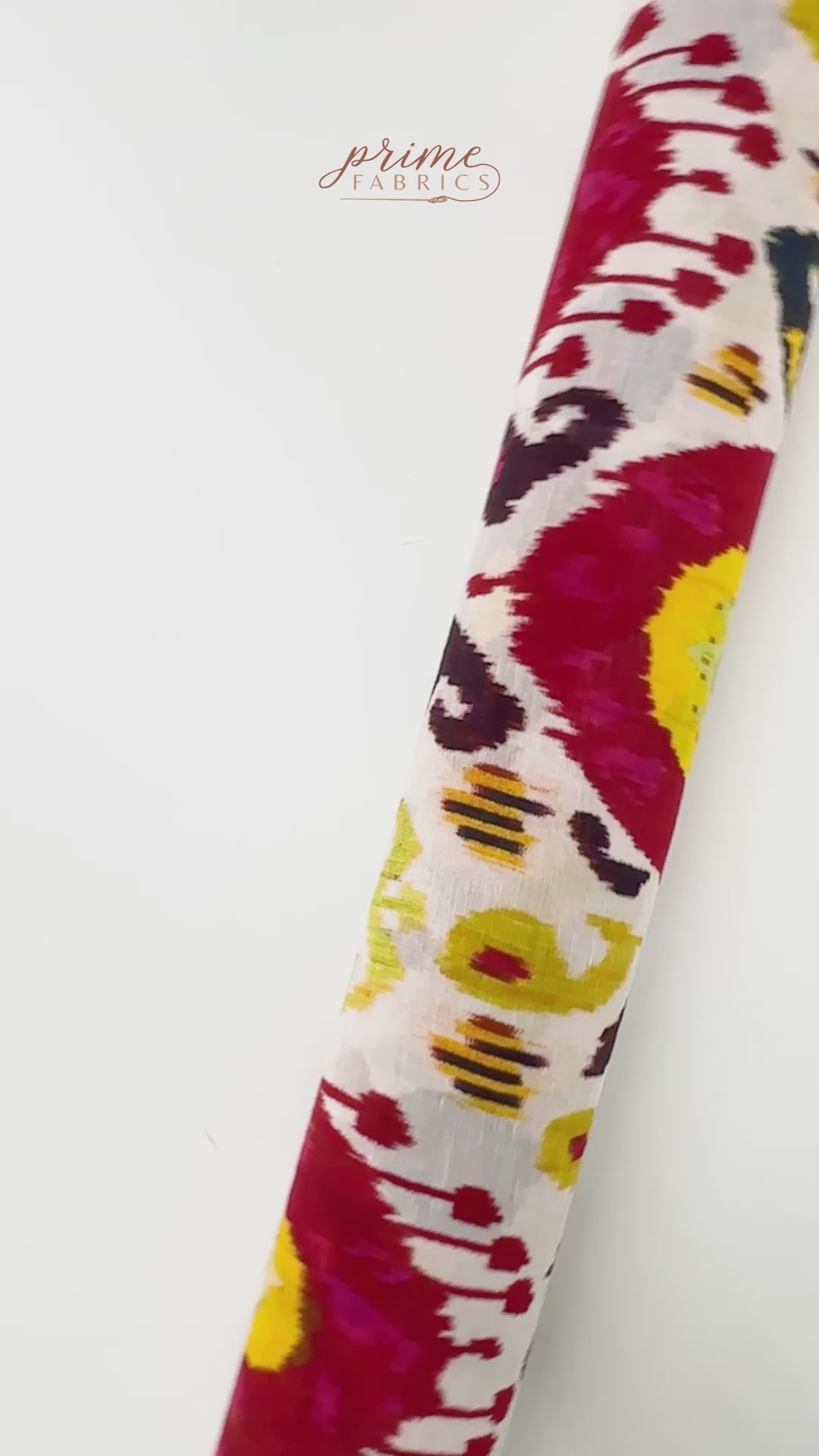 A lightweight viscose-linen blend with a bold ikat-inspired print in ruby, golden yellow, and navy. The hand is dry and textured, while the weave is airy and fluid, with a sheer quality that catches the light. Perfect for breezy dresses, layered blouses, or statement resort wear that thrives on movement and color.