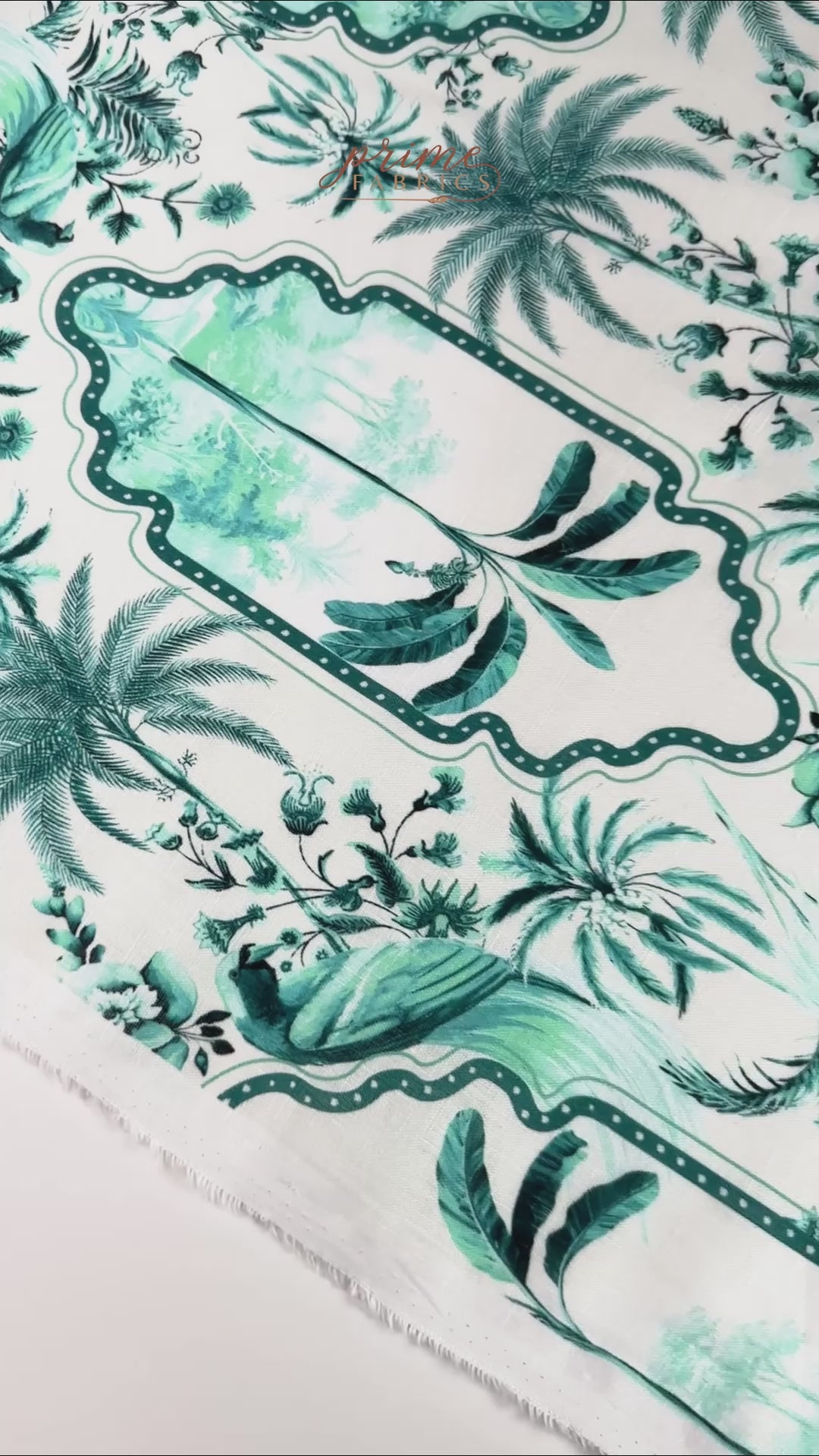 This printed linen features a tropical toile-style motif in serene shades of teal and aqua, evoking a vintage resort aesthetic. The balanced mid-weight makes it ideal for relaxed trousers and shirts. Crisp, breathable, and elegant—perfect for summer tailoring with personality.