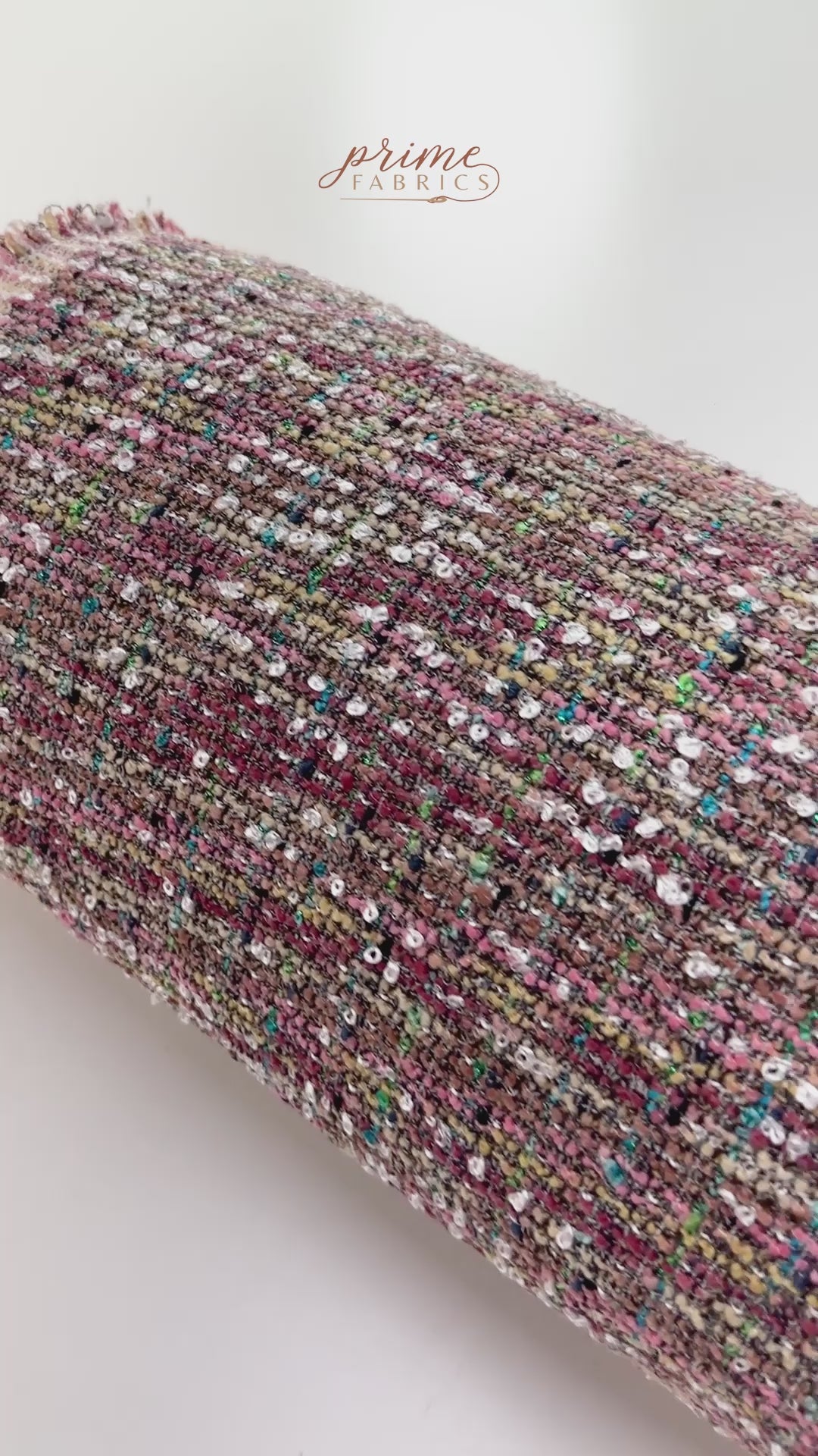A Valentino wool-blend bouclé tweed, vibrant and full of texture. Shades of pink, blue, and green interplay with earthy neutrals, lifted by flecks of turquoise and subtle metallic threads for a touch of light. Soft, breathable, and slightly lighter than traditional coating tweeds, it drapes with ease—ideal for jackets, skirts, or dresses that call for movement. A couture tweed that balances classic craftsmanship with a lively, modern palette.